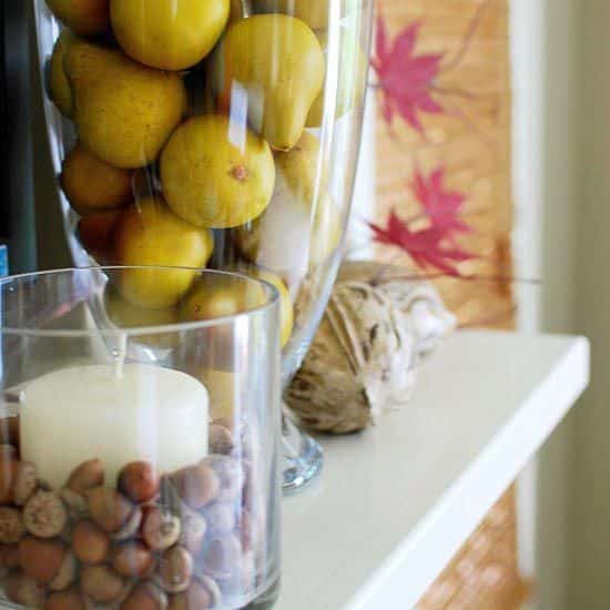 Autumn Collection::You can find these large glass candle holders and vases at the dollar store. Then fill them with some natural goodies that you collect as you get out and enjoy the crisp fall air with the family.