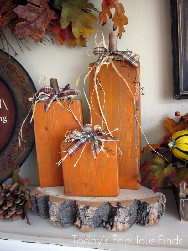 Simple Pumpkins:: Cut some small complimentary size pieces from scrap 2×4’s then let the kids paint them. You can even distress them a little bit with a few swipes of sandpaper. Whatever you have lying around will do. Hot glue some ribbon/twine and a small stick on top.
